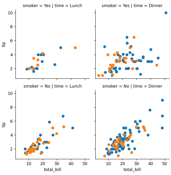 time ( dinner, lunch) smoker( Y/ N)로 나누어져 있기 때문에 2행 2열의 격자가 만들어짐.