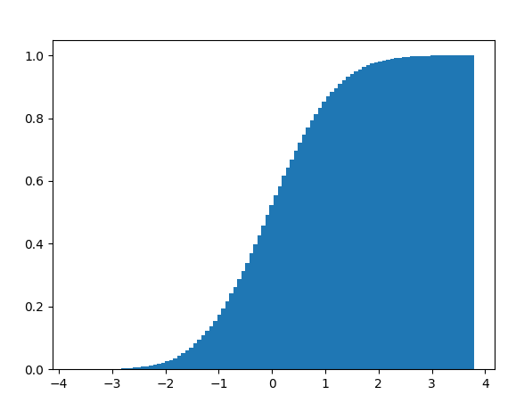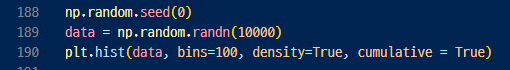 - bins = 구간설정 / destiny = True ( 정규화 ) / cumulative = True (누적 히스토그램)