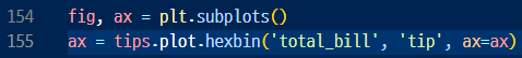 ax = tips.plot.hexbin(x='total_bill', y='tip', gridsize=10, ax=ax)