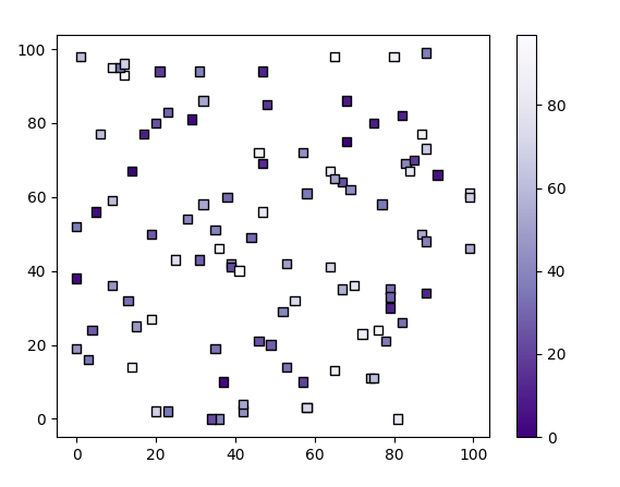 * s는 크기 marker는 모양 color= 색, edgecolors= 점테두리 , c = 마커농도, cmap=색상 계열 설정