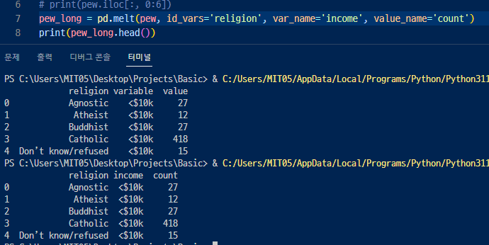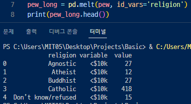 id_vars 인자값으로 지정해준 religion을 제외하고 모두 열로 정리되고 열의 데이터들도 정리되었음.