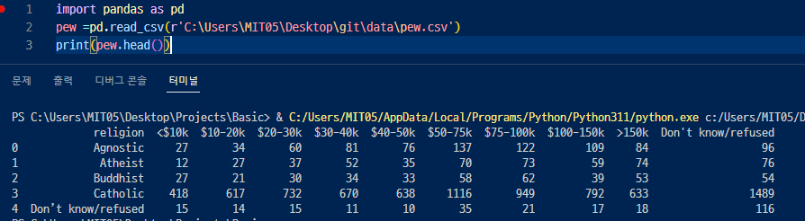 ▲ 그러니까 소득 정보가 열을 구성하고 있음.