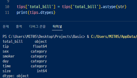 일단 total_bill이라는 열항목을 str으로 바꿔줬음.
