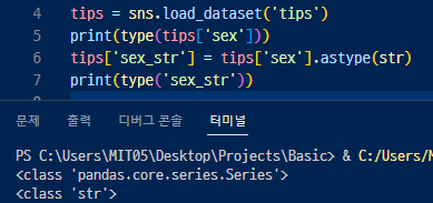 원래 시리즈형태인 tips['sex']를 astype(str)으로 변환해 'sex_str'의 열로 새롭게 저장해주고