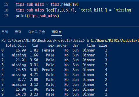 데이터에서 1,3,5,7 행의 total_bill 열의 데이터를 missing으로 바꿔서 새로 저장해줌