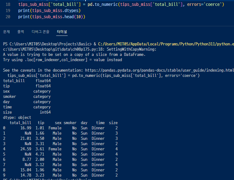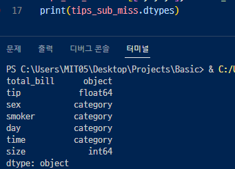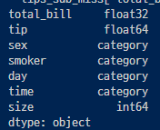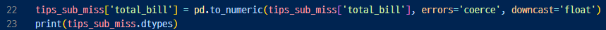 그리고 나서 보면 missing(얘가 문자열)으로 인해 total_bill이 object 문자열로 바뀌었다는걸 알 수 있음.