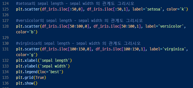 setosa, versicolor, virginica 세 종(species)의 붓꽃(iris)에 대해 sepal length( 꽃받침의 길이), sepal width(꽃받침의 폭), 꽃잎의 길이(Petal length), Petal width(꽃잎의 폭)을 사용해 sepal length - sepal width 관계도를 그리시오