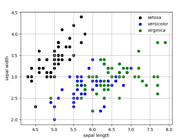setosa, versicolor, virginica 세 종(species)의 붓꽃(iris)에 대해 sepal length( 꽃받침의 길이), sepal width(꽃받침의 폭), 꽃잎의 길이(Petal length), Petal width(꽃잎의 폭)을 사용해 sepal length - sepal width 관계도를 그리시오