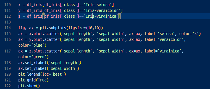 x, y, z 값에 class에 분류되어 있는 것을 나눠줌 그리고 하나하나씩(열 이름으로 불러와서) 그림 그렸움