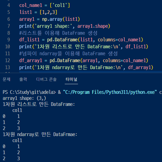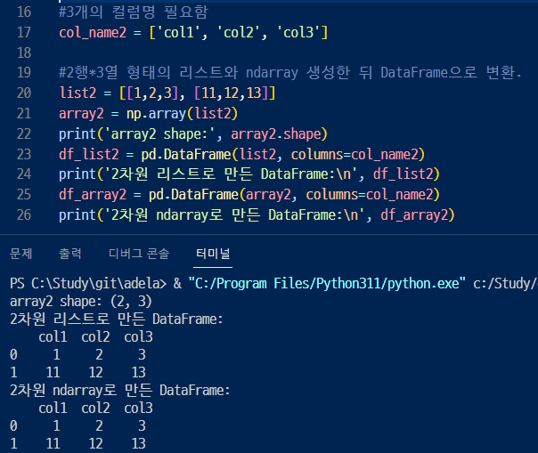 - 2행 3열 형태의 리스트와 ndarray를 기반으로 DataFrame을 생성하므로 컬럼명은 3개가 필요