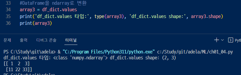 - DataFrame.values 메서드를 쓰면 ndarray 변환할 수 있음.