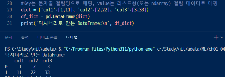- 딕셔너리의 Key는 컬럼명으로 Value는 컬럼 데이터로 변환됨. 그래서 키는 문자열, 값은 리스트 형태로 구성