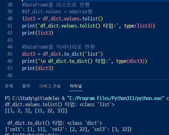 <DataFrame을 리스트와 딕셔너리로 변환>