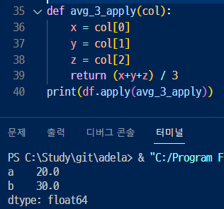 3. 그리고 3개의 인자를 입력받아 평균을 계산하는 함수를 만들고 데이터프레임에 적용시켜보면