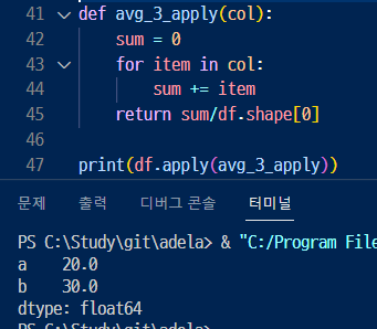 ▶ 이를 통해 apply 메서드에 전달하는 함수의 첫 번째 인자는 데이터프레임이나 시리즈가 자동으로 전달되는걸 알수 있음.