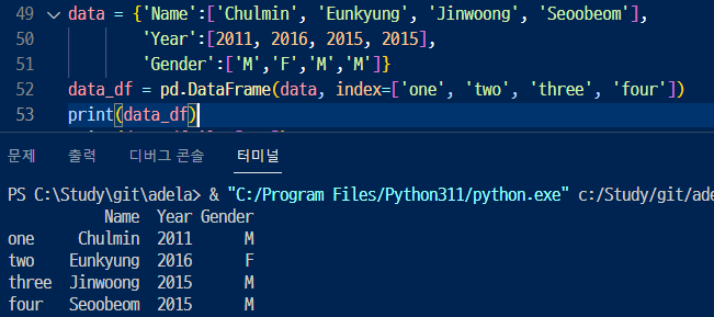 ▷ 하지만 이름이나 컬럼명을 입력하면 오류가 발생한다. 인덱스 값을 입력해도 마찬가지