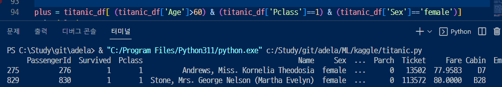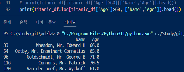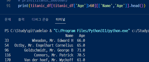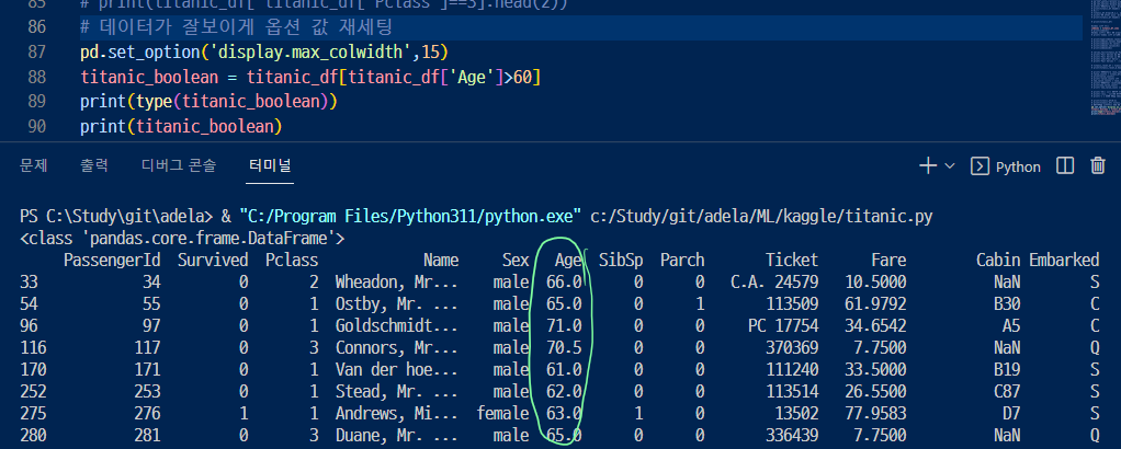 ▶승객 중 나이(Age)가 60세 이상일 때 데이터 추출해봤다. [ ] 안에 불린 조건을 입력할 수 있다.