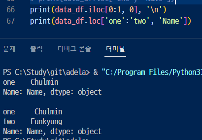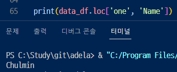 - 명칭 기반으로 데이터 추출. loc [ 인덱스값, 컬럼명]과 같은 형식으로 데이터 추출.