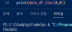 ▶ 여기서 첫번째 행, 첫 번째 열의 데이터를 iloc [] 를 이용해 추출해 보니까 이렇게 나온다.