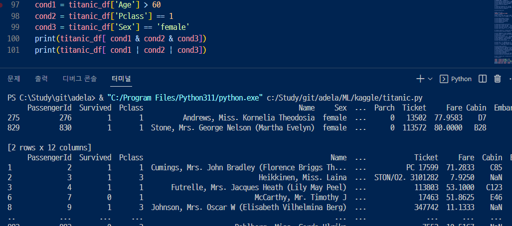 그럼 True인 값들만 반환된다. 반환될때는 DataFrame이다.