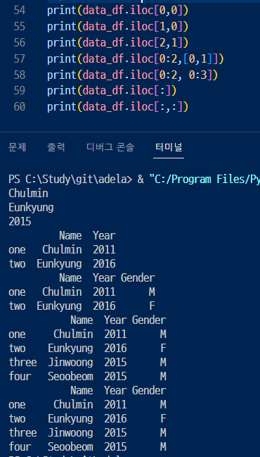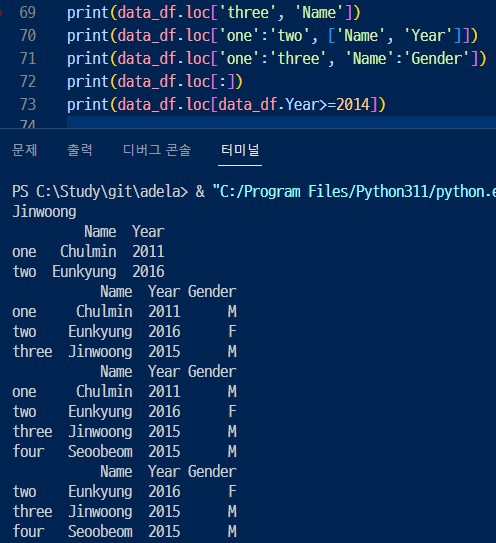 ▶ 슬라이싱할때 정수값은 0:3 이면 0부터 2까지를 의미하지만, loc [ ] 슬라이싱에는 종료값까지 포함.