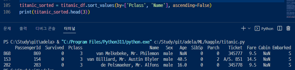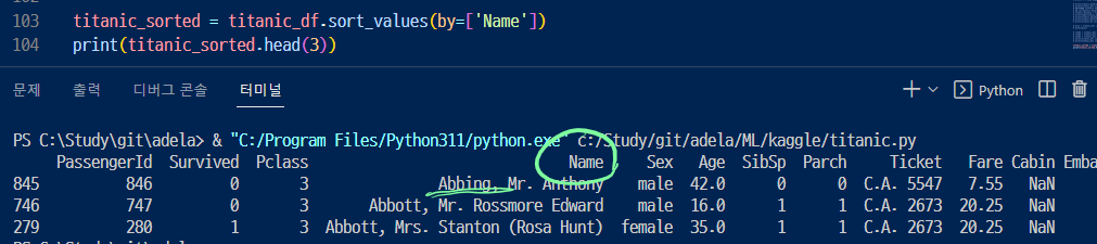 - 파라미터는 by='칼럼' (해당 칼럼으로 정렬 수행), ascending=True(오름차순, False 내림), inplace=False(원본은 유지 True면 원본이 바뀜)