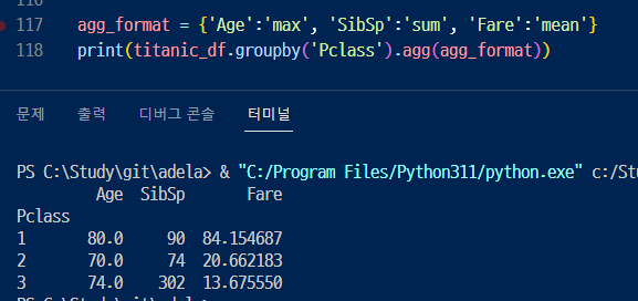 ▶ 딕셔너리 형태로 aggregation이 적용된 컬럼과 함수를 입력하면 됨.