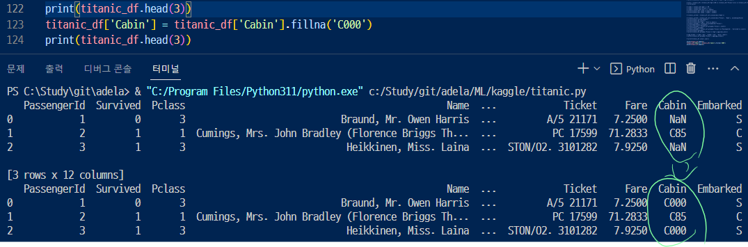 ▷여기서는 123행, titanic_df['Cabin'] = 이라고 반환 값을 다시 받았다.