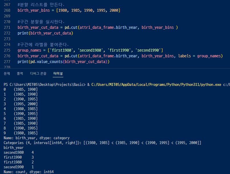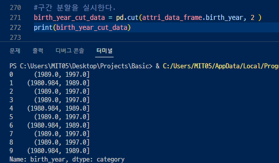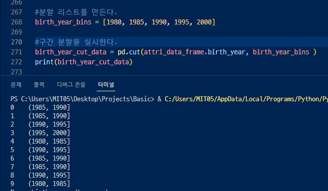 - 두번째 인수로 분할수를 전달해주면 비슷한 크기의 구간을 만들 수 있다.
