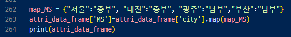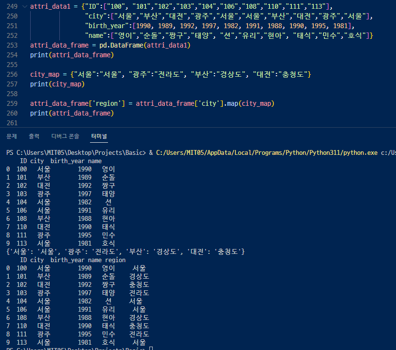 - 딕셔너리의 key와 지정한 열의 값이 같으면 새로운 딕셔너리의 value가 열로 추가된다.