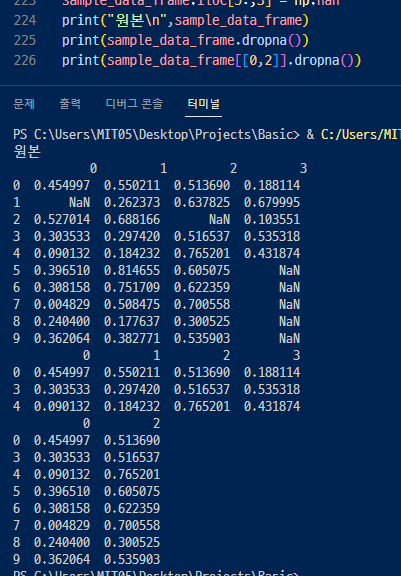 : 원하는 열의 인덱스값을 인자로 전달해주고 dropna() 를 한다면 전달한 인자값의 인덱스 열은 살고 나머지는 다 지워지지지만 남아있는 열의 중 NaN이 있는 행값은 삭제된다.