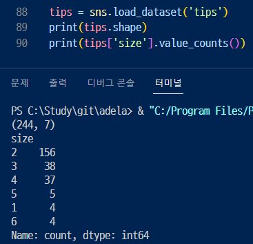 ▶ tips 데이터 집합을 불러와 크기를 확인하고