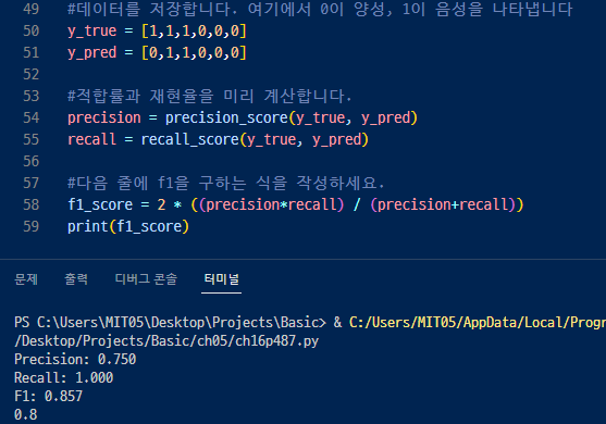 * 적합률precision(정밀도) : 양성으로 예측된 데이터 중 실제로 양성인 것의 비율
