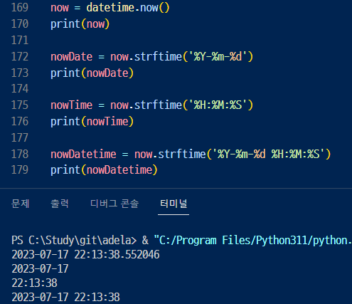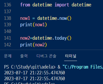 ▶ datetime의 now와 today 메서드를 사용하면 현재 시간을 출력할 수 있음.