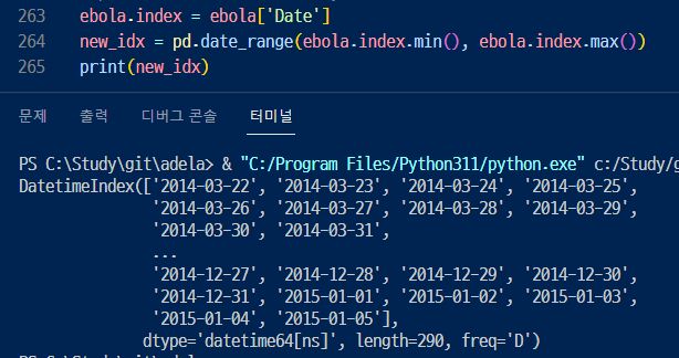 ▶Date을 인덱스로 설정하고 최댓값과 최솟값으로 시간 범위를 생성해서 new_idx에 저장하고