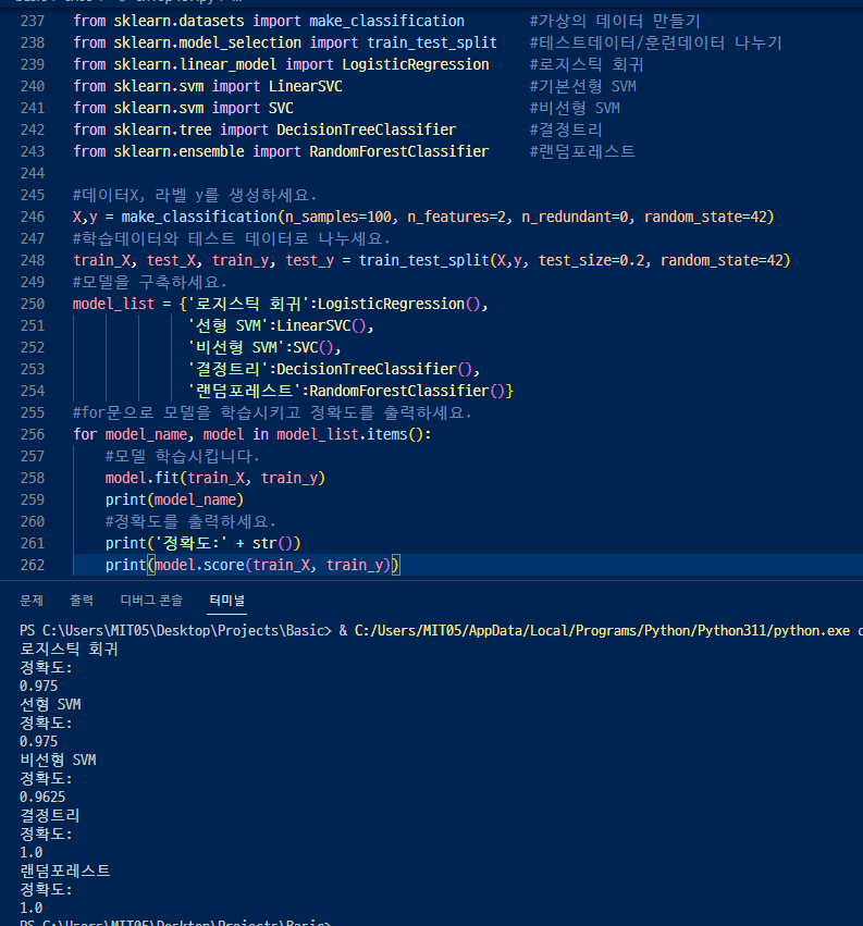 4. for문으로 모델을 학습시키고 정확도를 출력한다.