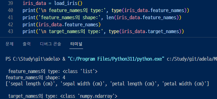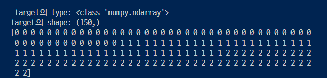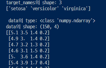 : data, target은 넘파이배열 타입이고 target_names, feature_names()는 넘파이 배열 or list임.