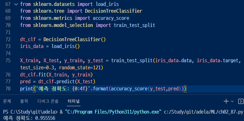▶ 75행 : test_size = 전체 데이터에서 테스트 데이터 세트 크기를 얼마나 할것인지, 디폴트는 0.25(25%)