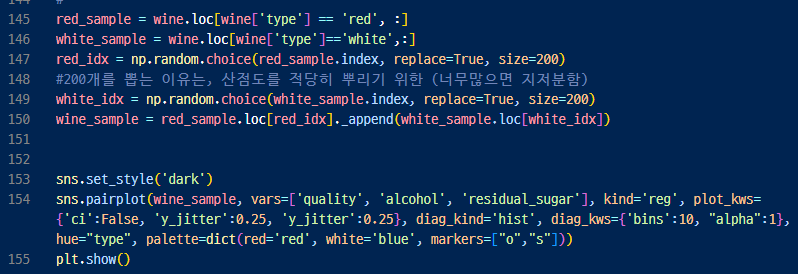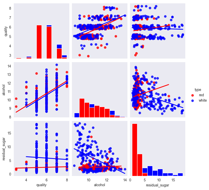 알코올 도수는 양의 상관관계, 잔여당은 음의 상관관계 (회귀선을 통해 확인 가능)