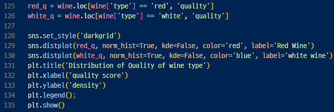 ▶ 분석결과를 시각화한것인데. 와인유형에 따른 품질 등급을 히스토그램으로 나타냄.
