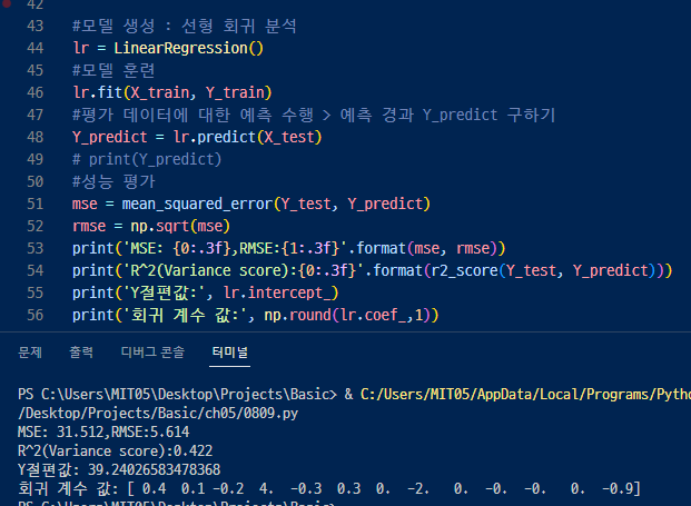▶ 50~54행 : 성능 평가, 회귀 분석은 지도 학습이므로 평가 데이터 X에 대한 결과값 YY_test를 이미 알고 있는 상태에서
