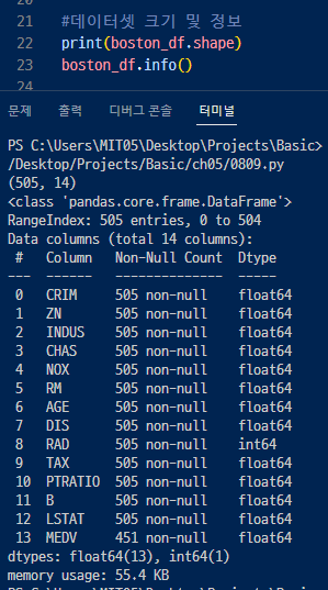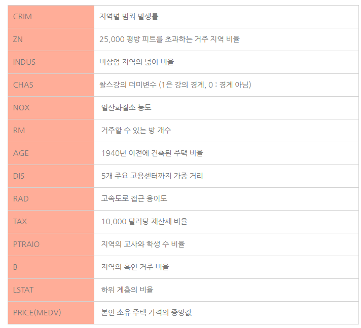 | 데이터 준비 및 탐색 | 1. 사이킷런 데이터셋 확인 : boston.DESCR 2. 사이킷런 데이터에셋에 지정된 + 피처와 타깃 피처 결합 |