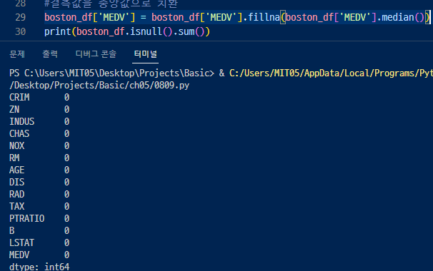 ▲결측값이 'MEDV'열에서 54개 있기 때문에 (27행에서 해봄) 처리해야함.