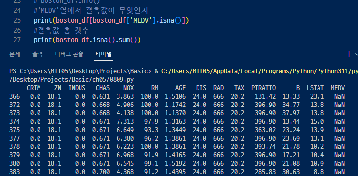 ▲ 'MEDV'열에서 결측값이 어디어디 있는지 궁금해서 출력해봄..ㅎ...(25행)