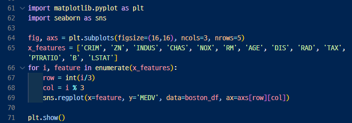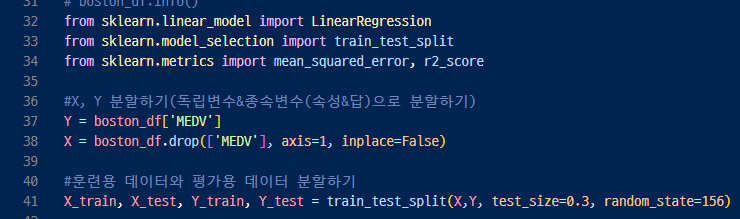 ▶ 37~38행 : 독립변수 / 종속변수로 X,Y 분할하고 (MEDV가 출력값임)
