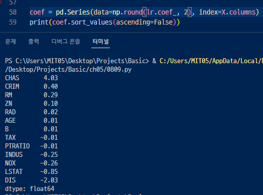 - lr.coef_과 피처 이름을 묶어서 시리즈자료형으로 만들고, 회귀 계수(기울기) 값을 내림차순으로 정렬.