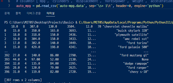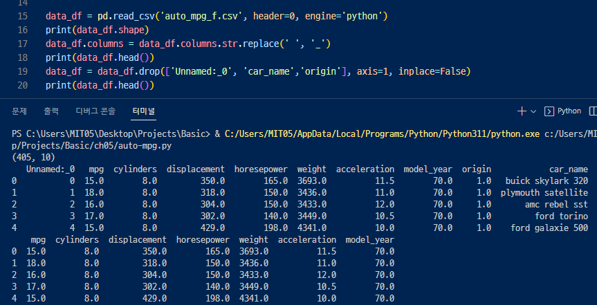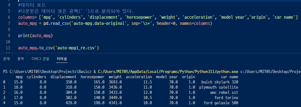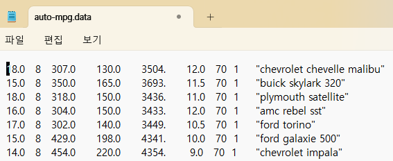 데이터 수집:자동차 연비 데이터 : UCI Machine Learning Repository에서 다운로드( https://archive.ics.uci.edu/dataset/9/auto+mpg )