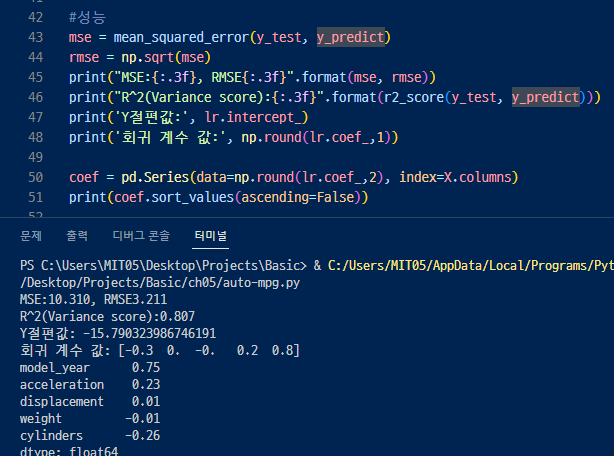 선형회귀의 Y절편과 피처의 회계지수(기울기)도 구해서 회귀식을 만들어봄