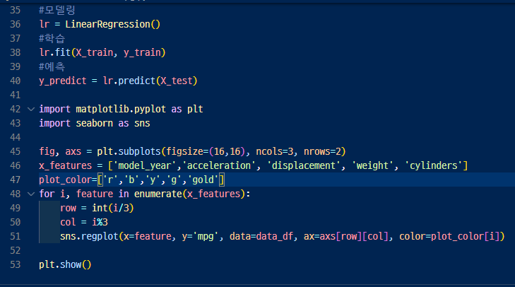 ▶ 36행 > 선형회귀분석모델로 모델링 해주고 fit으로 학습해주고 predict로 예측해주고