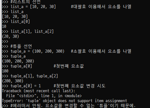 b. 요소를 하나만 가지는 튜풀이라면 쉼표를 넣어 선언 ex. tuple_a=(273,)